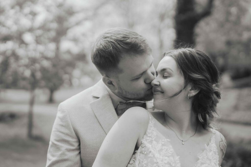 Wedding Photographer A bride and groom sit close together in the back seat of a car, sharing a kiss. Captured by a Fotografin Göttingen, this black and white photo shows the bride in a floral dress and bouquet, the groom in a suit—an intimate wedding moment.